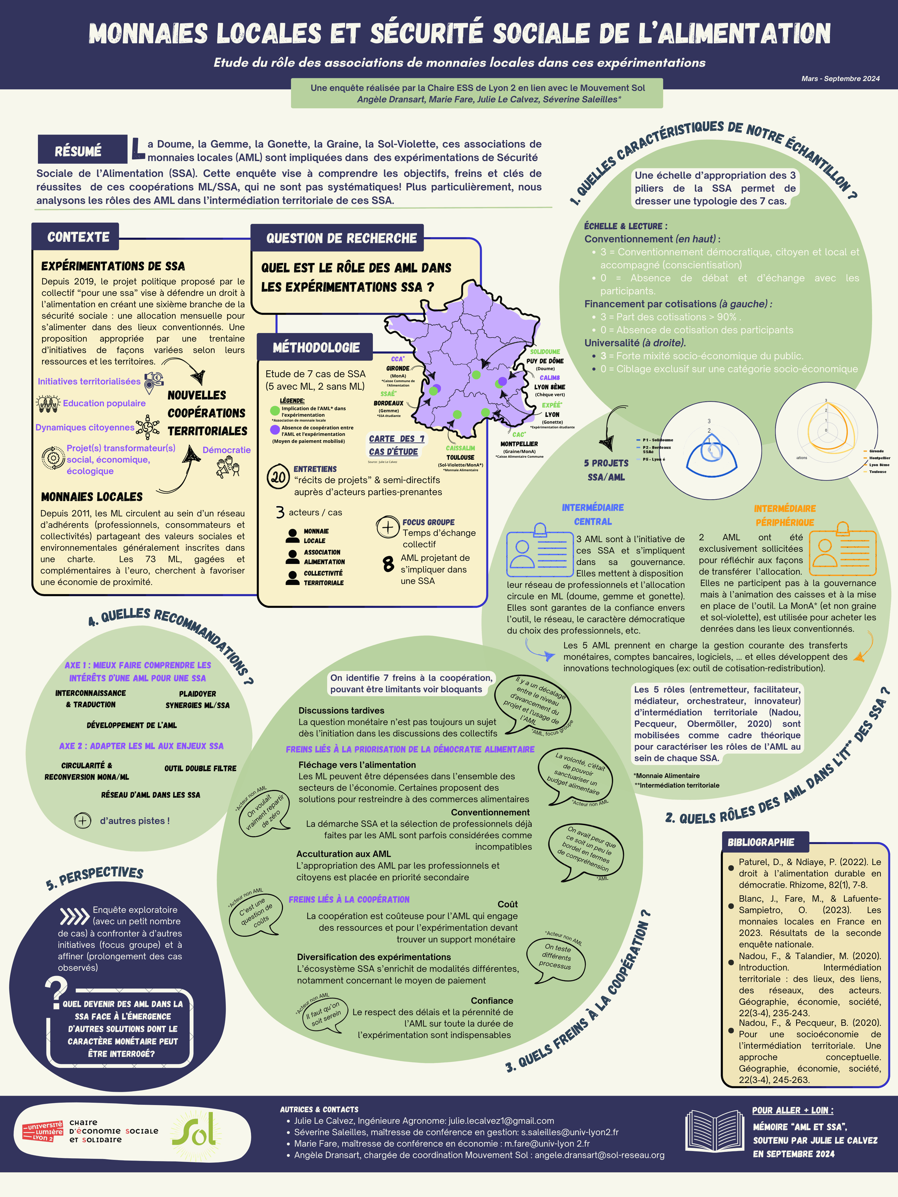 En 2024, la Chaire ESS de l'Université Lyon II a mené une étude sur les synergies entre MLC et SSA. Réalisée par Julie Le Calvez, encadrée par Marie Fare (Laboratoire Triangle) et Séverine Saleilles (Coactis), cette étude s'est penchée sur 7 expérimentations réparties sur 5 territoires :
